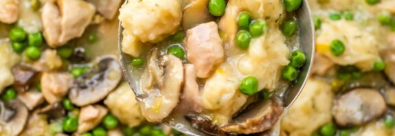 Chicken and Dumplings with Leeks, Mushrooms and Peas