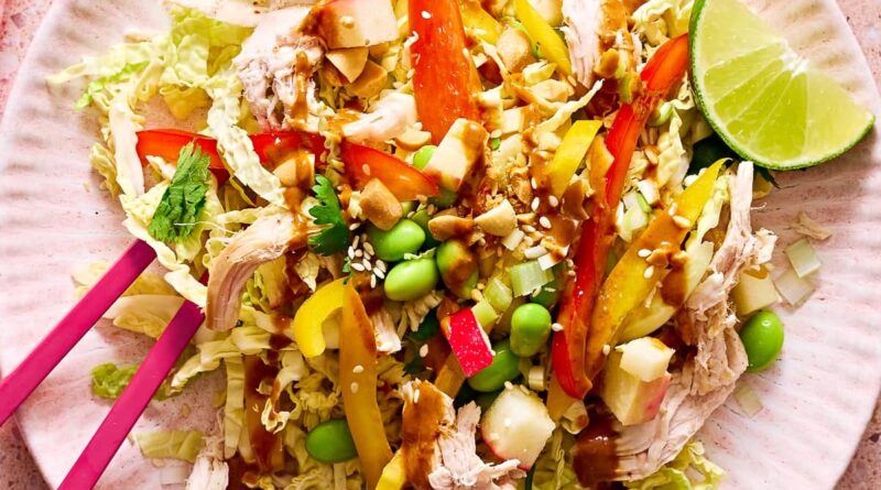 Read MoreThis post may contain affiliate links. Read my disclosure policy. This high-protein, Thai-inspired chicken salad features crunchy slaw, edamame, fresh