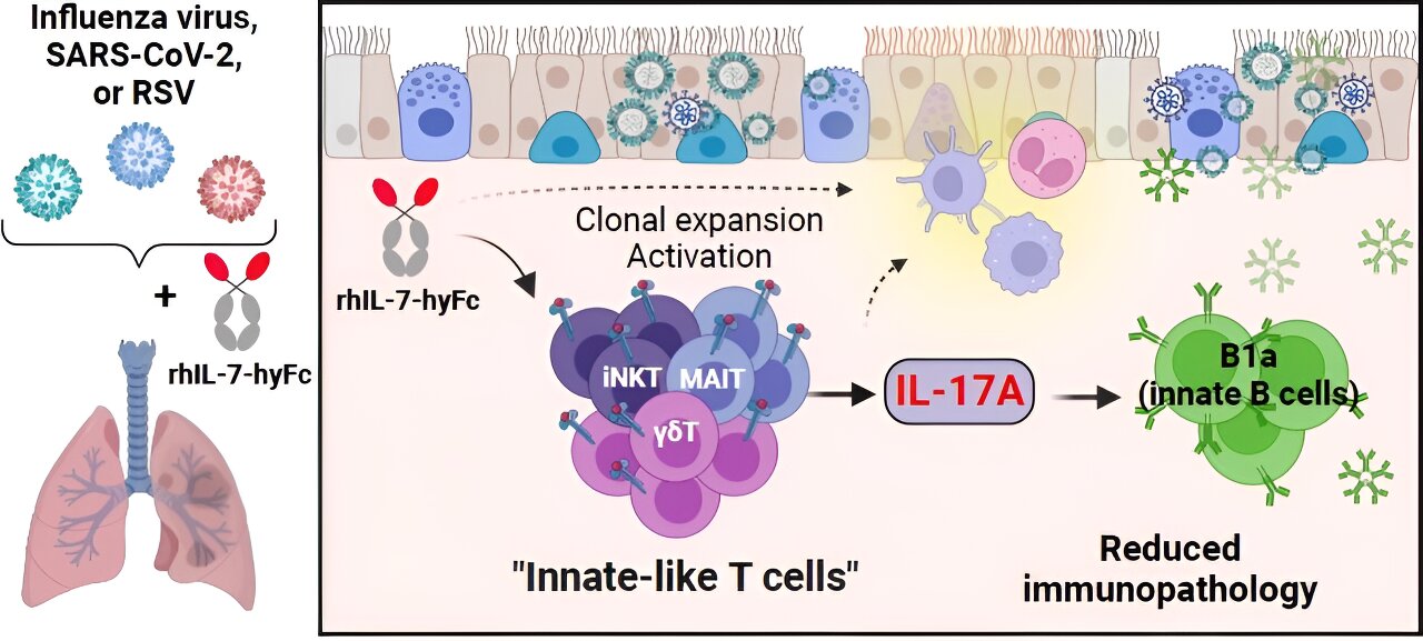 Dong-il Kwon et al, Fc-fused IL-7 provides broad antiviral effects against respiratory virus infections through IL-17A-producing pulmonary innate-like T cells, Cell Reports Medicine (2024). DOI: 10.1016/j.xcrm.2023.101362