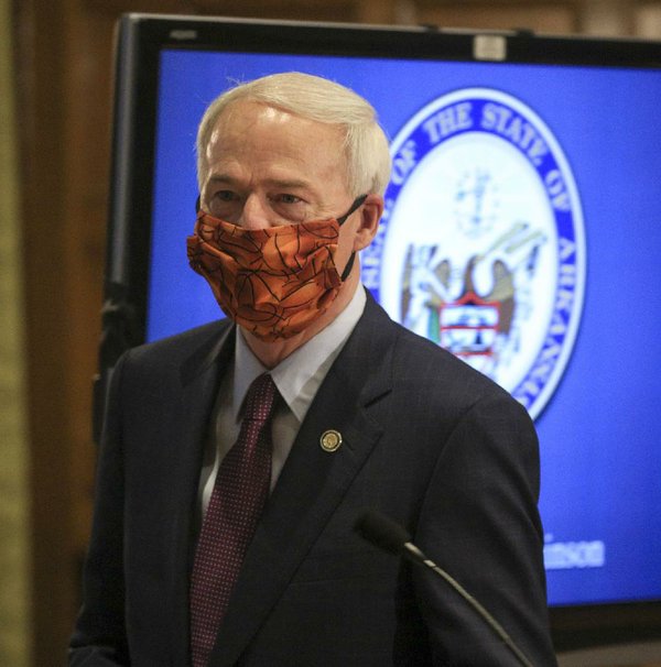 Gov. Asa Hutchinson arrives wearing a mask Friday May 29 for the daily COVID-19 briefing at the state Capitol. –