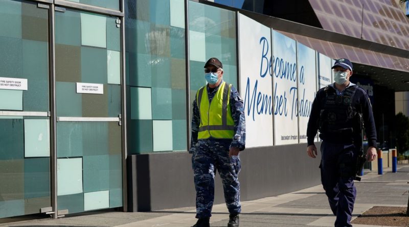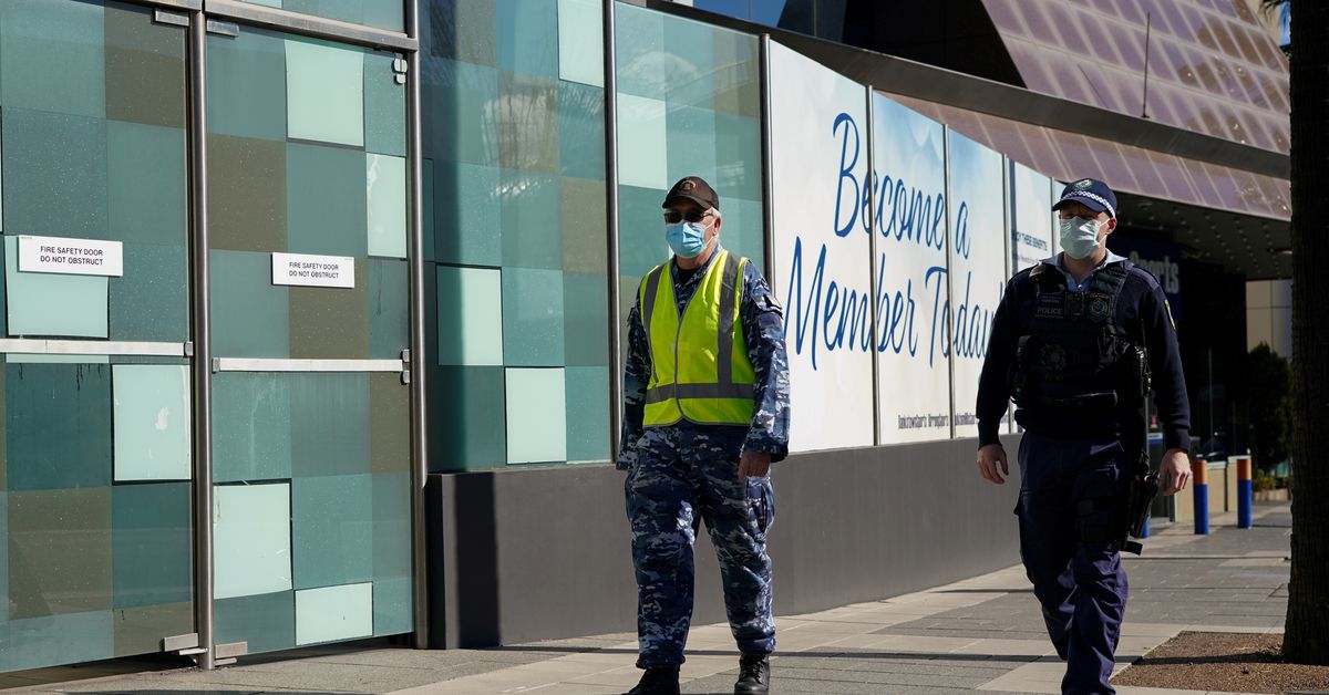 Personnel from the Australian Defence Force and New South Wales Police Force patrol a street in the Bankstown suburb during an outbreak of the coronavirus disease (COVID-19) in Sydney, Australia, August 3, 2021. REUTERS/Loren Elliott/File Photo