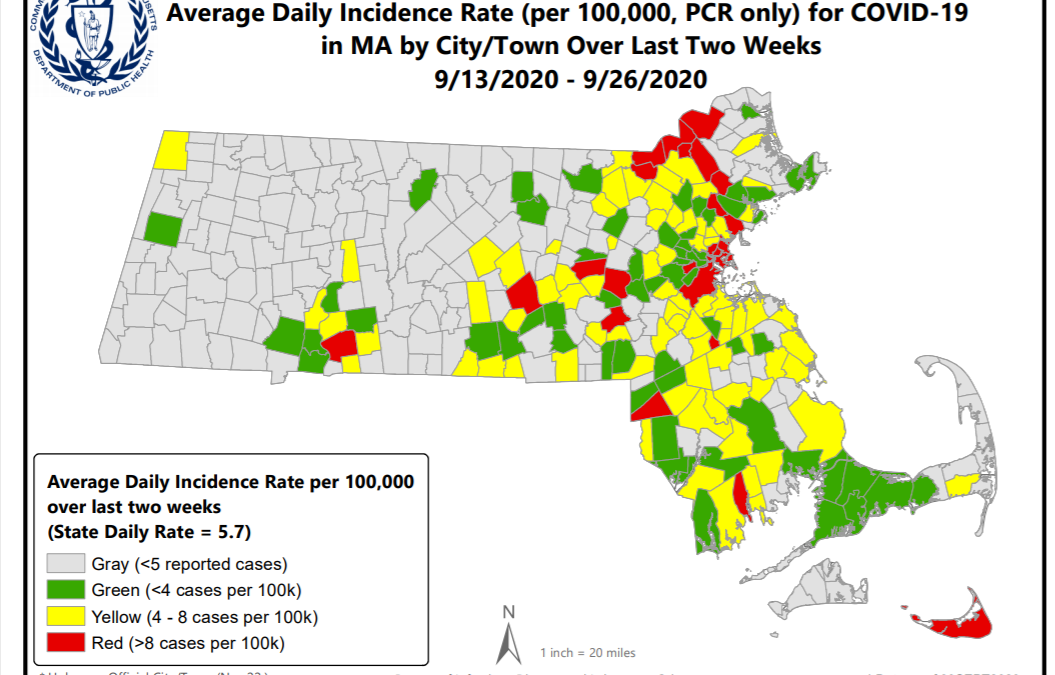 Mass. Dept. of Public Health This map shows the average daily number of coronavirus cases per capita in Massachusetts from Sept. 13-26, 2020.