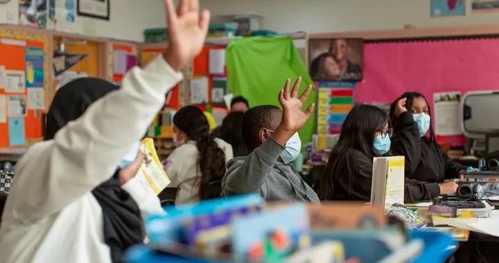 California in January 2024 released new COVID-19 isolation guidelines that allow people to return to work or school if they are asymptomatic. Here, students in Theresa Griffin’s sixth-grade class wore masks at Stege Elementary School in Richmond on Feb. 6, 2023. Photo by Shelby Knowles for Calmatters.