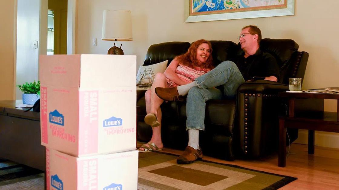 Juliette Saunders, 53, and her fiancee, David Clarke, 60, sit in the living room of their recently sold home in Fullerton on Sept. 15. Saunders and Clarke are moving to Texas after being furloughed and struggling with unemployment during the pandemic. Photo by Tash Kimmell for CalMatters