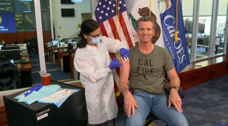Above: In this image taken from a live-streamed video from the California Governor’s Office, California Gov. Gavin Newsom getting a flu shot during a news conference on Monday, Sept. 28, 2020, in Rancho Cordova, Calif.