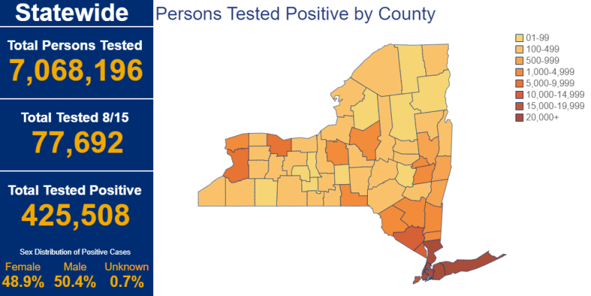 State COVID-19 Tracker numbers for Capital Region counties as of Sunday afternoon, Aug. 16. Testing data as of midnight Saturday night.