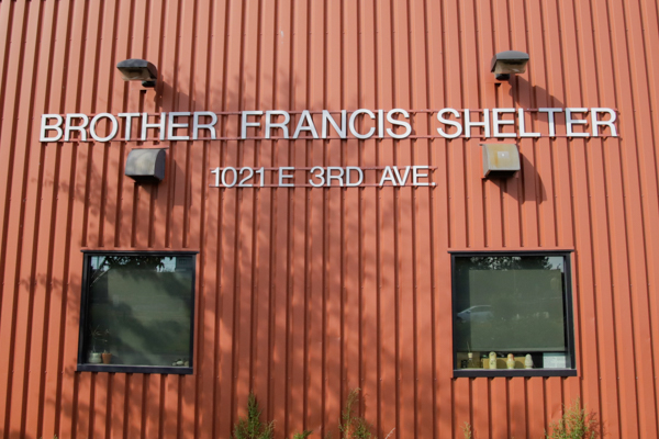 Words on a building red building that say "Brother Francis Shelter. 1021 E. 3rd Ave."
