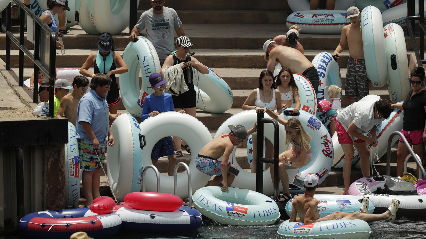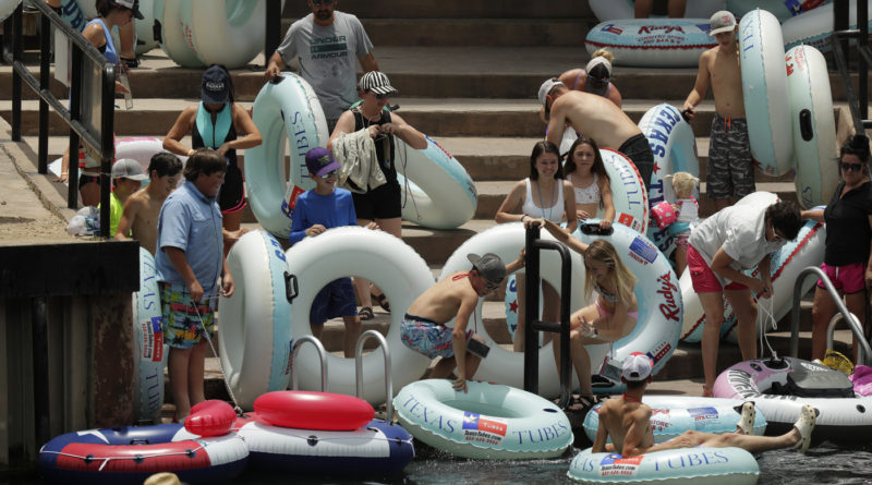 Tubers prepare to float the Comal River in New Braunfels, Texas, on Thursday. Texas Gov. Greg Abbott said Wednesday that the state is facing a “massive outbreak” of the coronavirus and that some new local restrictions may be needed to preserve hospital space for new patients.