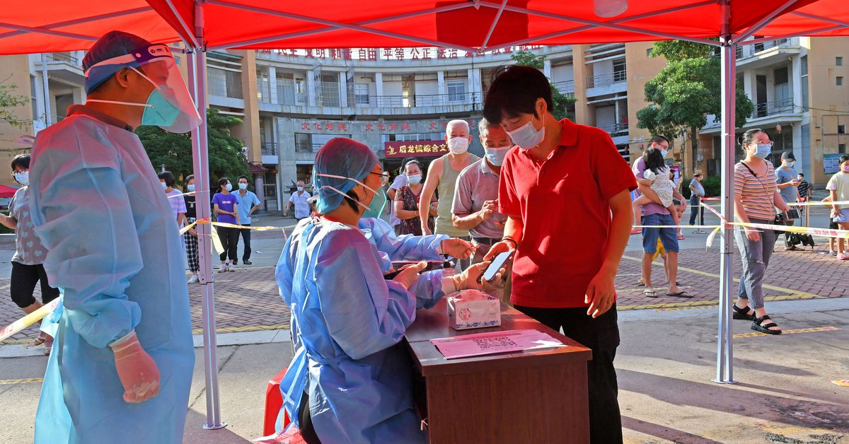 Residents register to take nucleic acid tests at a testing site in Quanzhou, following new cases of the coronavirus disease (COVID-19), in Fujian province, China September 13, 2021. China Daily via REUTERS ATTENTION EDITORS – THIS IMAGE WAS PROVIDED BY A THIRD PARTY. CHINA OUT.