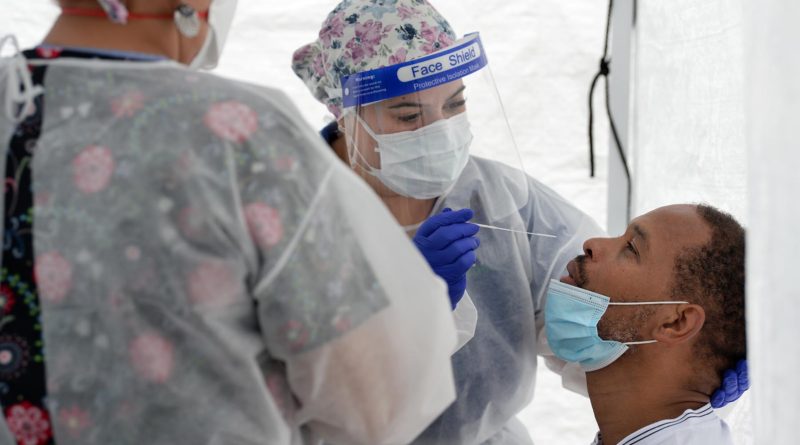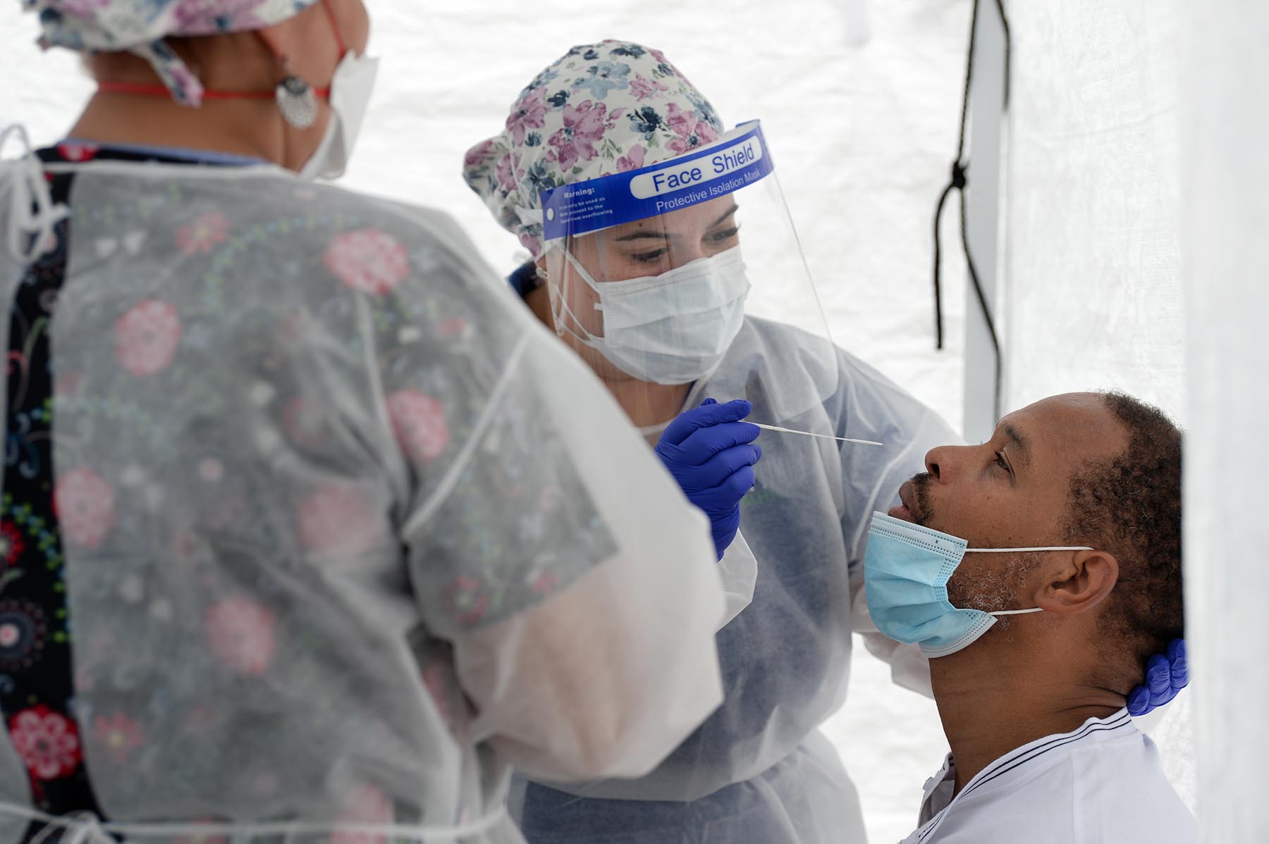 Ed Lomax, of Bridgeport, leans back for Julyssa Colon, a nurse with Optimus Health Care, to insert a nasal swab to test for COVID-19 at a mobile test site set up by Optimus Health Care in the parking lot of the Russell Temple Church in Bridgeport on June 30.The Rev. Leroy Perry Jr. rolled up his sleeve and received a dose of Pfizer’s experimental COVID-19 vaccine as part of his effort to urge parishioners and others, especially those in Waterbury’s Black community, to participate in the pharmaceutical’s final clinical trial.