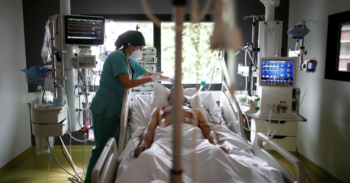 A healthcare worker provides care for a COVID-19 patient in the Intensive Care Unit (ICU) at the Centre Cardiologique du Nord private hospital in Saint-Denis, near Paris, amid the coronavirus disease pandemic in France, May 4, 2021. REUTERS/Benoit Tessier