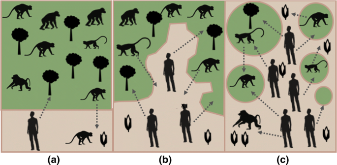 Tropical forests are often cut down in a patchwork or checkerboard pattern, increasing the amount of land that lies at the edges of the forest and thus increasing the risk for disease transmission between species that would normally live in different ecosystems.