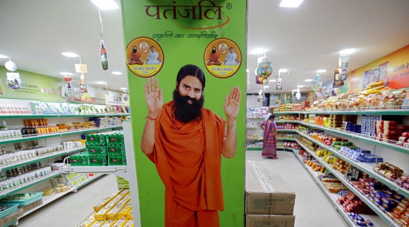 A hoarding with an image of Baba Ramdev is seen inside a Patanjali store in Ahmedabad, India, March 28, 2019. REUTERS/Amit Dave/File Photo