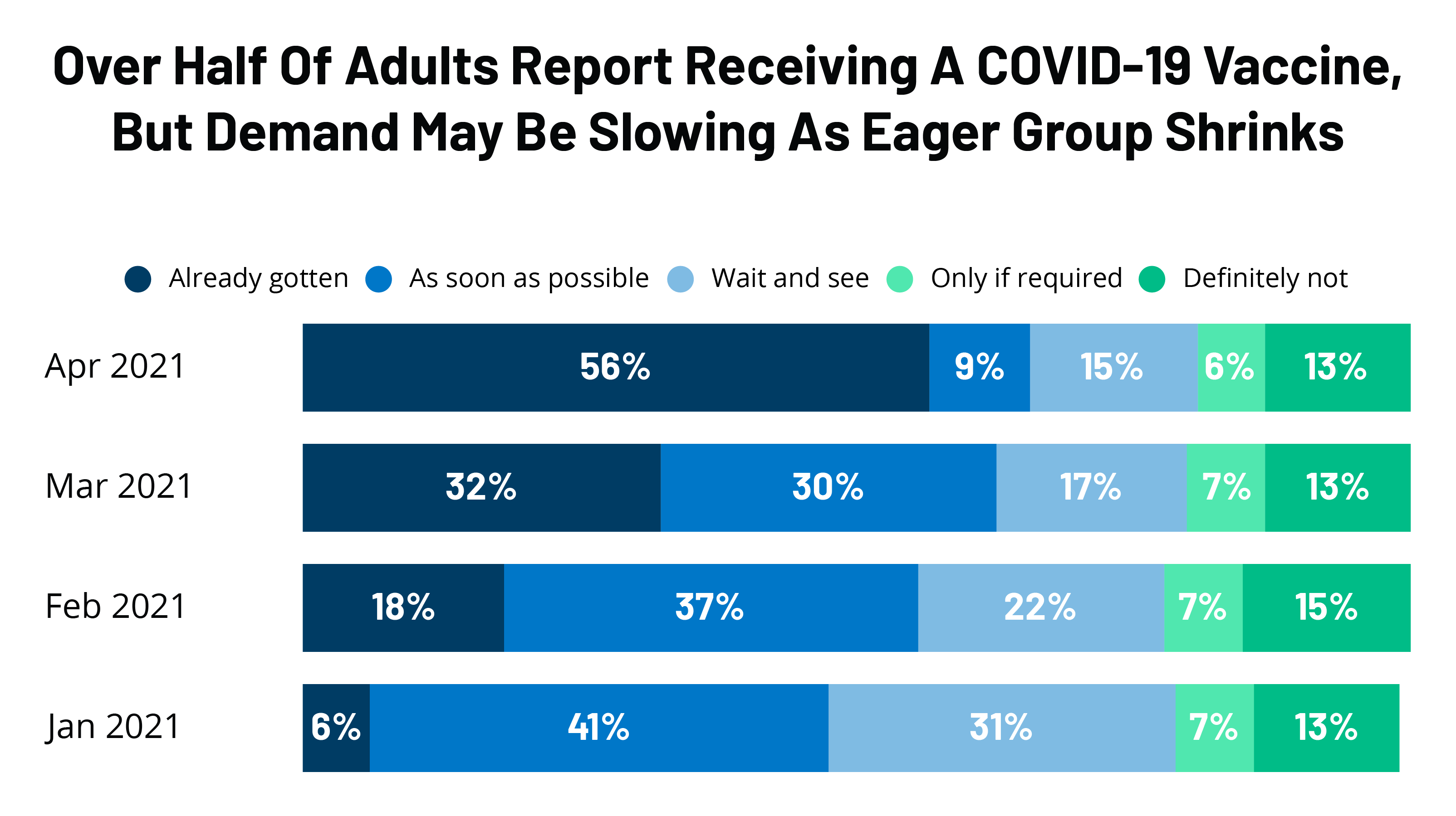 With eligibility for COVID-19 vaccination now open to all adults in the U.S., the latest KFF COVID-19 Vaccine Monitor reports that a majority of adults now say they have already gotten at least one dose of the vaccine (56%), up from 32% in March. At the same time, the share of ready and willing adults who have not yet gotten vaccinated but say they intend to do so as soon as they can has fallen to 9% from 30% in March when many adults were still not eligible for vaccination. Overall, the total enthusiastic group (those who say they’ve already been vaccinated or will get it as soon as possible) inched up only slightly from 61% in March to 64% in April, while the share of adults who say they want to “wait and see” appears to have plateaued at 15%, similar to the 17% who said the same in March. The shares of the public who say they will get the vaccine only if they are required to do so for work, school, or other activities (6%) or say they will “definitely not” get the vaccine (13%) have stayed about the same since January.