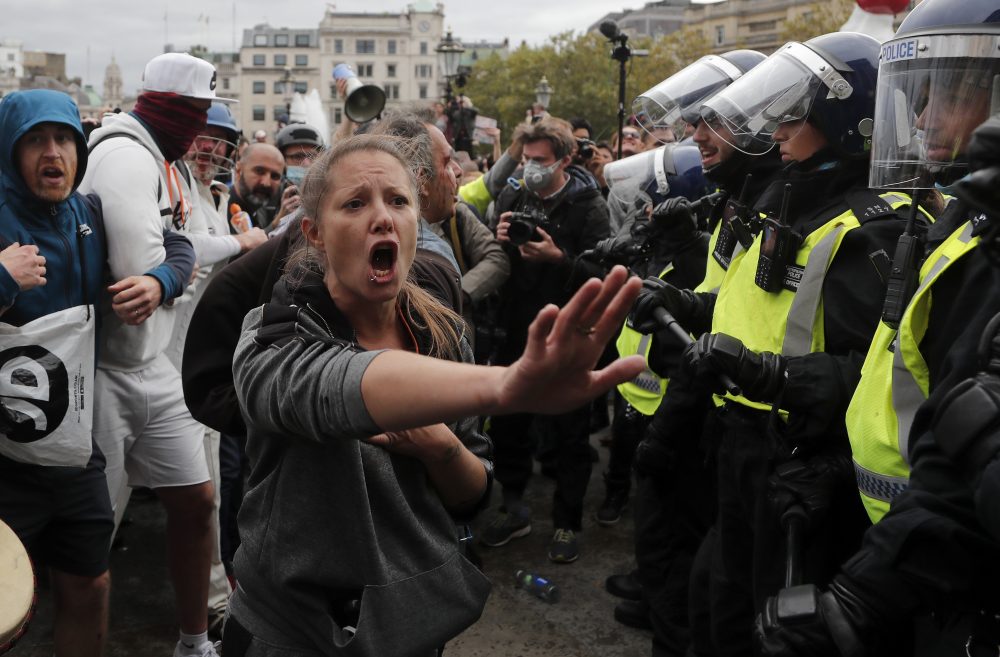 LONDON — London police clashed with demonstrators on Saturday as they broke up a protest in Trafalgar Square against COVID-19 restrictions amid rising tensions over limits on everyday life as the government tries to stem a sharp rise in infections.