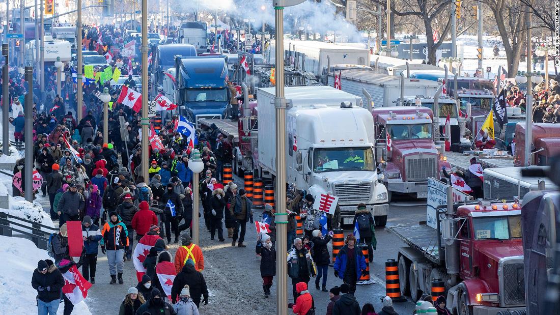 This weekend’s protests grew out of the “Freedom Convoy” that made its way through Canada for several days before arriving in Ottawa on Saturday. It began as a protest by truckers opposed to vaccine requirements, before gaining followers calling for an end to other Covid-19 mandates as well.