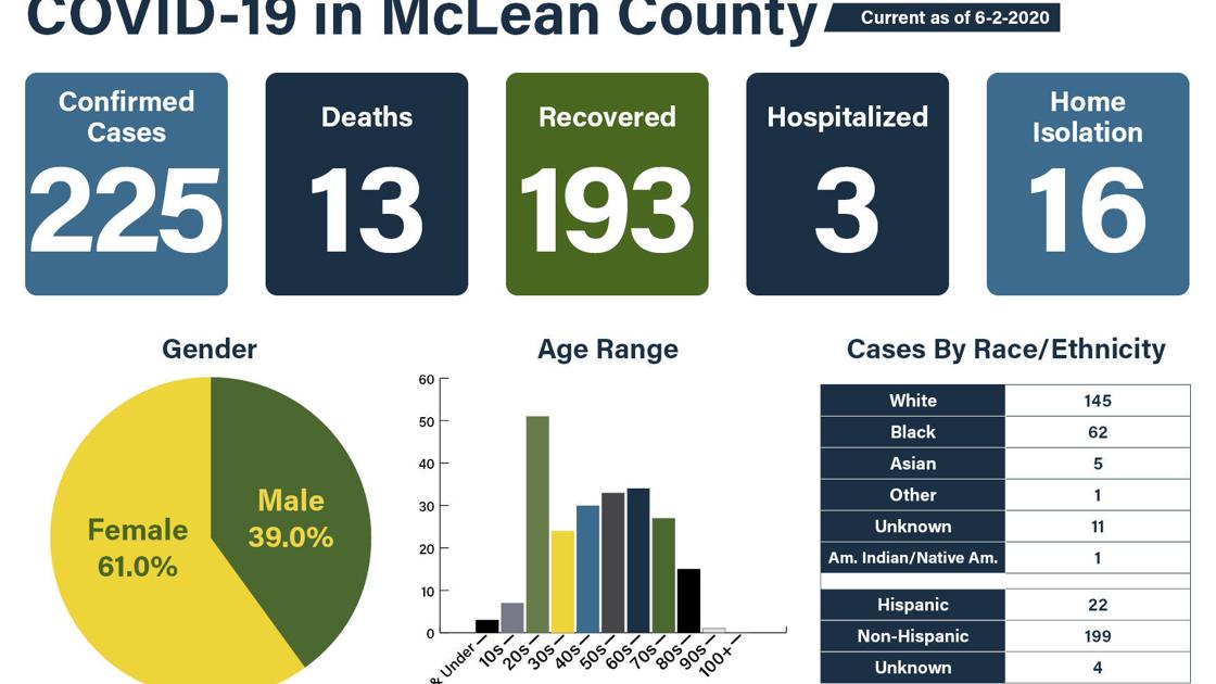 There have been 225 official cases in McLean County since March 19. Thirteen people have died, three remain hospitalized and 16 are in home isolation.