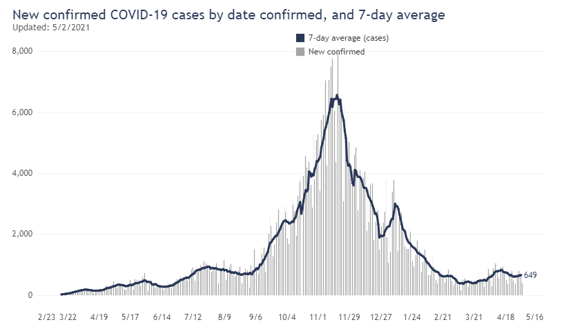 The Department of Health Services dashboard shows the seven-day average of positive tests. (CHART)
