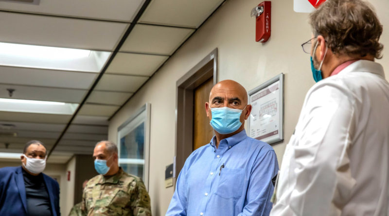 Operation Warp Speed leaders Moncef Slaoui (second from right) and Gen. Gustave Perna (second from left) speak with Cincinnati physicians Carl Fichtenbaum (far right) and O’dell Moreno Owens (far left) during a visit to one of the sites for the efficacy trial of Moderna’s COVID-19 vaccine candidate.