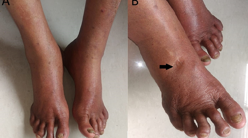 An 86-year-old male came to the outpatient department (OPD) in June 2021 with a fever (temperature – 102°F) and joint pain complaints for seven days. Fever was insidious in onset, high grade, followed a saddleback pattern, and was associated with chills. The joint pain was insidious in onset and migratory, involving multiple hands, feet, elbow, and knee joints. It was associated with early morning pain and swelling in the hands and feet. One day before visiting the OPD, he developed a pruritic, maculopapular rash that affected the lower limbs, followed by the trunk. He also complained of myalgia, headache, photophobia, vague abdominal pain, nausea, and decreased appetite. There was no history of bleeding, epistaxis, or petechiae. Non-contributory socioeconomic history There is no history of allergies or medication abuse, nor has there been any surgery in the past. There was no previous history of similar illnesses. The patient was hospitalized for five days till the fever was resolved, and post-discharge symptomatic treatment including non-steroidal anti-inflammatory drugs (naproxen 250 mg tablet twice daily) was given for arthralgia and myalgia. Bed rest was advised. The drugs relieved his pain. 20 days after the onset of the joint pain and fever, he developed bilateral pitting edema of the leg (Figures 1A, 1B). The edema was refractory to treatment. Thiazide diuretics (metolazone 5 mg tablet) were administered weekly for 10 doses, but they did not reduce edema in the legs.