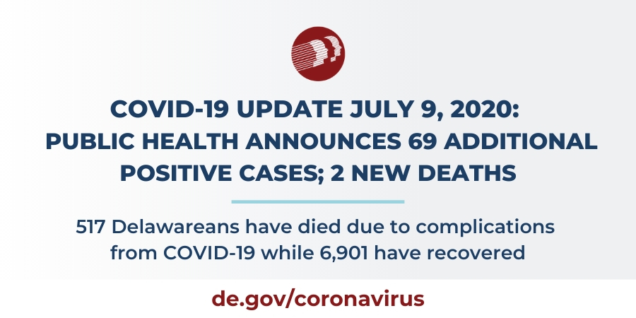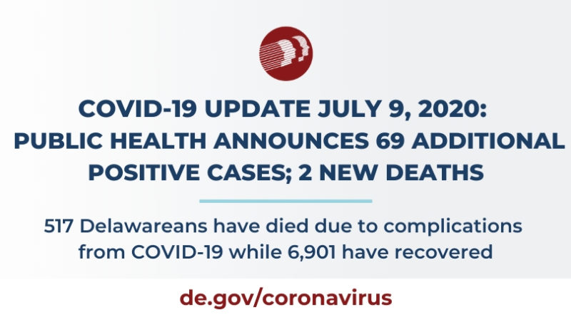 SMYRNA (July 8, 2020) – The Delaware Division of Public Health (DPH) is announcing 69 additional positive cases of coronavirus disease 2019 (COVID-19) in Delaware, as of 6:00 p.m., Wednesday, July 8, 2020. Two new deaths were also reported. In addition, 63 individuals are currently hospitalized due to COVID-19 in Delaware, 12 of whom are critically ill.