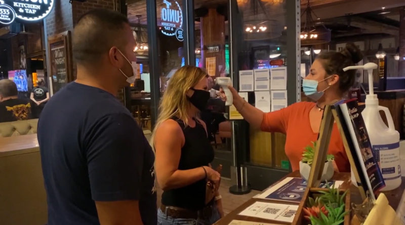 Above: A hostess at Union Kitchen and Tap checks a customer’s temperature before seating them, Sept. 16, 2020.