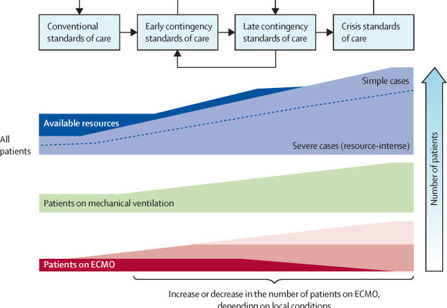 Experts have recommended that ECMO be curtailed or even halted when patient numbers surpass an ill defined threshold, wherein demand for critical care outstrips available resources.