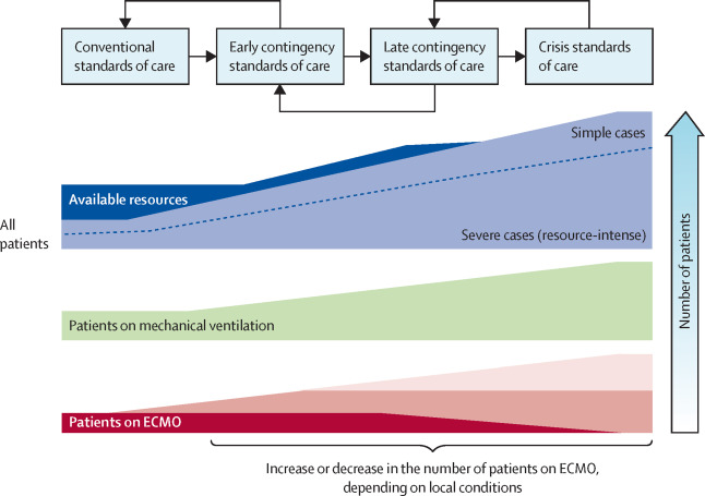 Before life-saving treatments are rationed, efforts should be taken to extend available resources and to use them most efficiently and effectively. These efforts have to be continued, even after entering crisis standards of care, to return to a previous step as soon as possible. Depending on the ethical principles adopted and patient characteristics, levels of ECMO offered could be the same as those provided during normal circumstances, reduced, or even increased during the transition from normal to crisis standards of care. ECMO=extracorporeal membrane oxygenation.