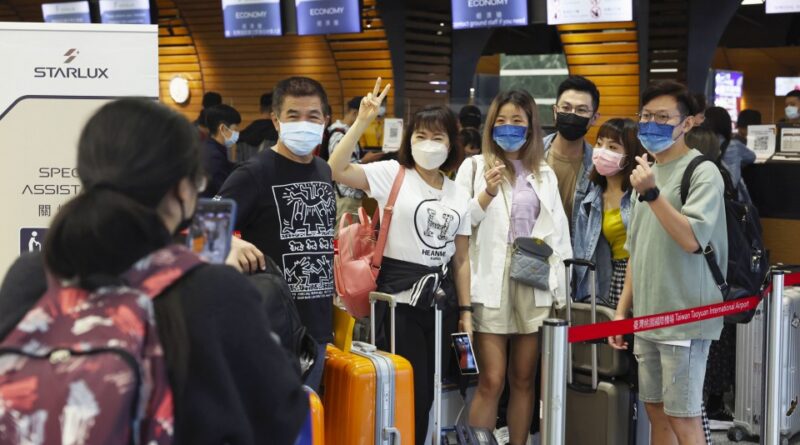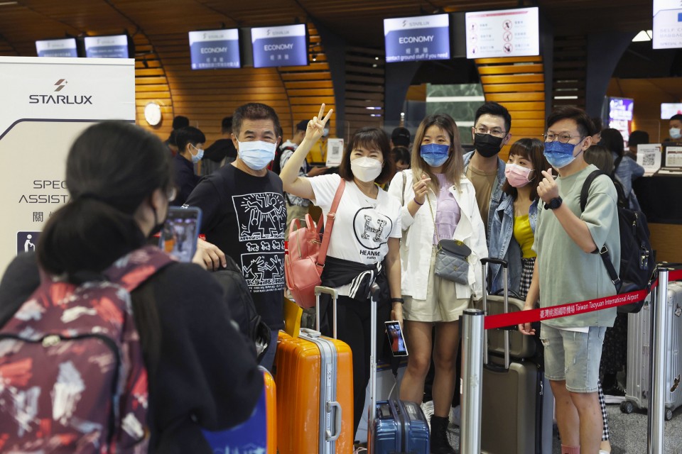Travelers pose for photos ahead of departure from Taiwan’s Taoyuan International Airport on Oct. 13, 2022. (Central News Agency/Kyodo)