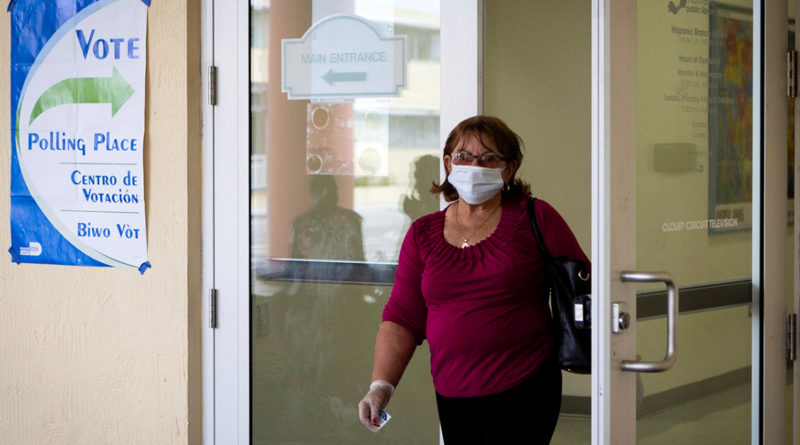 A woman wearing a protective mask and gloves leaves after voting in Florida’s Democratic primary election at Miami-Dade Public Library Little Havana in Miami on March 17, 2020. (Eva Marie Uzcategui/AFP via Getty Images)