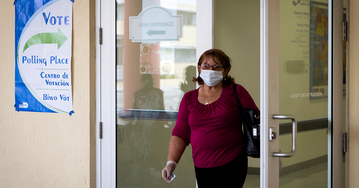 A woman wearing a protective mask and gloves leaves after voting in Florida's Democratic primary election at Miami-Dade Public Library Little Havana in Miami on March 17, 2020. (Eva Marie Uzcategui/AFP via Getty Images)