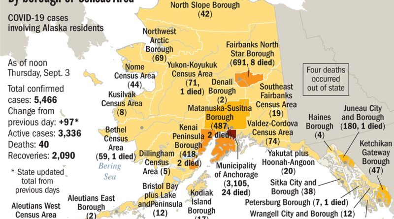The state’s death rate, however, remains one of the lowest in the country. Forty Alaskans have now died with the virus, including two residents of the Anchorage Pioneer Home, one of multiple communal living settings in Anchorage dealing with outbreaks of COVID-19.