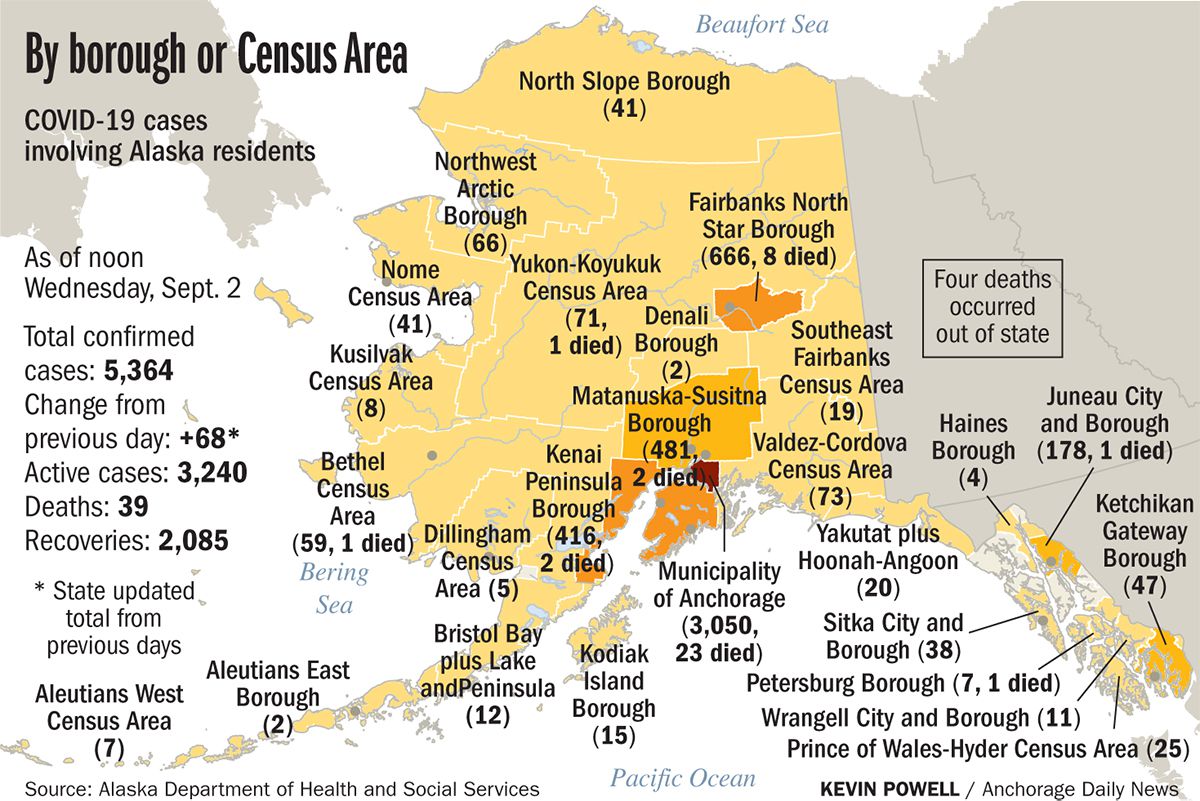 Of the 68 new cases of COVID-19 involving residents, 30 were in Anchorage; one in Eagle River; two in Kenai; two in Soldotna; 19 in Fairbanks; three in North Pole; four in Palmer; one in Wasilla; two in Utqiagvik; one in Juneau; one in the Southeast Fairbanks Census Area; one in the combined Yakutat and Hoonah-Angoon region; and one in the combined Bristol Bay and Lake & Peninsula boroughs.