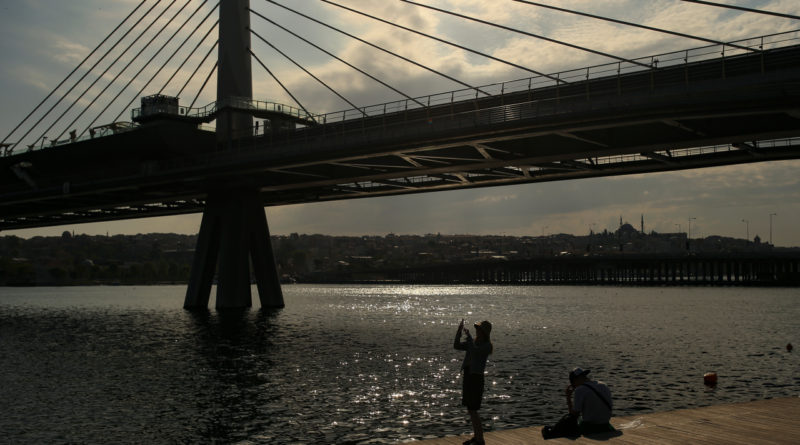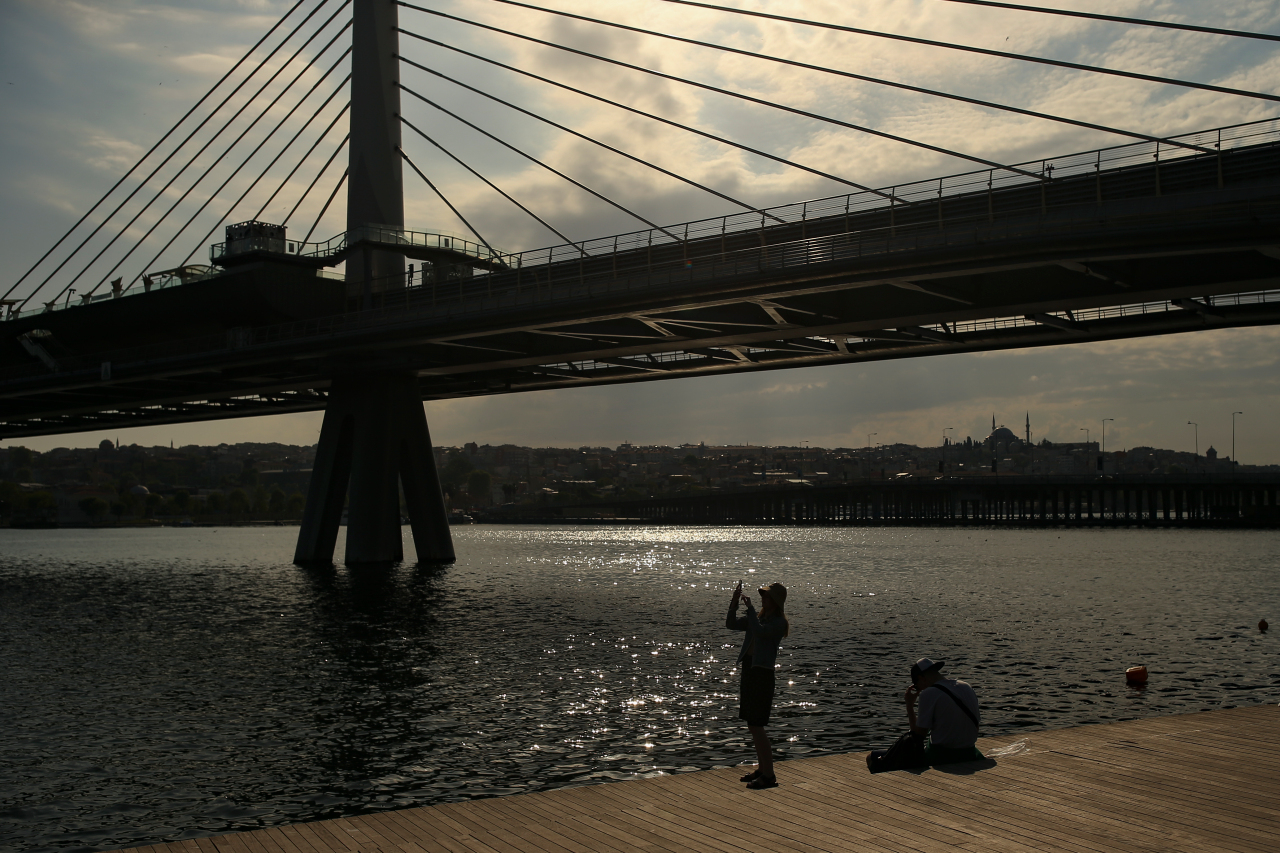 A woman takes a picture by the Golden Horn, leading to the Bosphorus Strait separating Europe and Asia, in Istanbul, Friday, May 14, 2021.Turkey is in the final days of a full coronavirus lockdown and the government has ordered people to stay home and businesses to close amid a huge surge in new daily infections. But millions of workers are exempt and so are foreign tourists. Turkey is courting international tourists during an economic downturn and needs the foreign currencies that tourism brings to help the economy as the Turkish lira continues to sink. (AP Photo/Emrah Gurel)