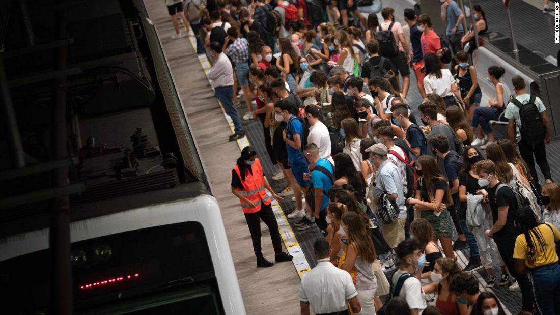 Students wait for a train to university, during rush hour in Barcelona, Spain, on Thursday.