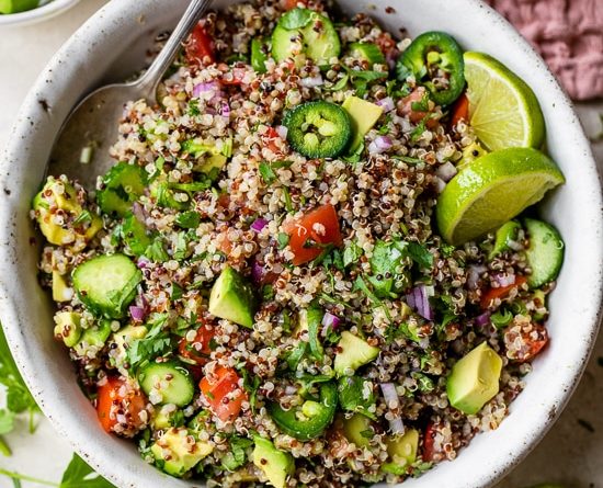 This healthy quinoa salad makes a great vegan lunch, but if you want to serve it for dinner as a side dish, this would serve four and be great with any protein such as Tequila Lime Shrimp, or Cilantro Lime Chicken. Double this recipe for more servings for a crowd, adding the avocado just before serving.