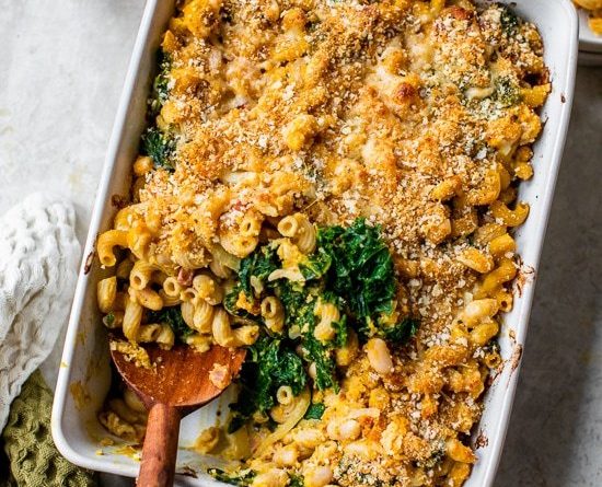 This healthy baked pumpkin pasta bake is total comfort food. I know it’s rare to hear the words “healthy” and “comfort food” in the same sentence but hear me out! The pumpkin, kale, cannellini beans, and whole-wheat pasta give this dish a ton of fiber, and the gruyere and pancetta give it that comfort-food element while adding protein. You can also try my Pumpkin Mac and Cheese with Roasted Veggies, and for a more pared-down version of this recipe, try my other Cheesy Baked Pumpkin Pasta.