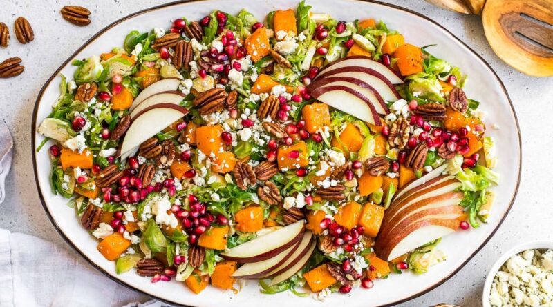 Butternut Squash Salad with shaved Brussels sprouts, pears, pomegranate, pecans, and Gorgonzola, drizzled with a maple-Dijon vinaigrette — a cozy fall side perfect for the holidays.
