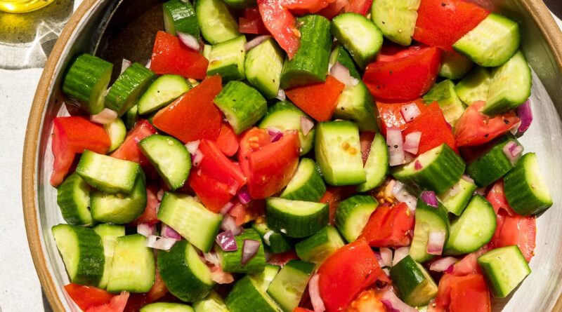 • Vegetable Swaps: Substitute a shallot for the red onion, cherry or grape tomatoes for the larger ones. If you use a regular cucumber, peel and seed it first.