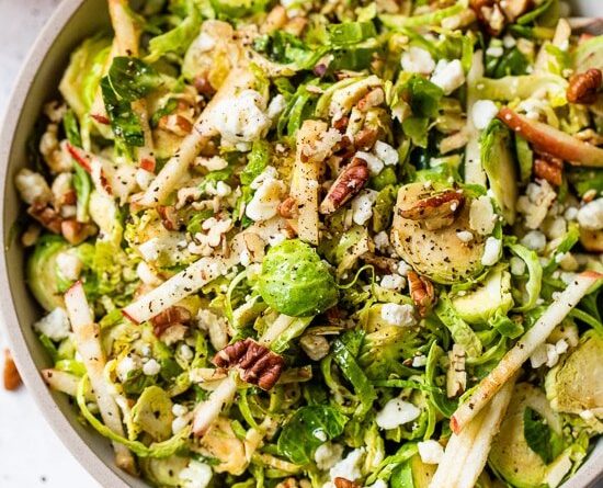 I love using raw, shaved Brussels sprouts in salads! You can buy them shredded, but I like to chop them myself so they’re fresher. For this easy Fall Brussels sprout salad recipe, I tossed them with sweet, crisp red apples, pecans, blue cheese, and a balsamic vinaigrette. If you’re looking for more Brussels sprouts salads, try this Raw Shredded Brussel Sprouts with Lemon and Oil and Shredded Brussels Sprout Salad with Bacon and Avocado.