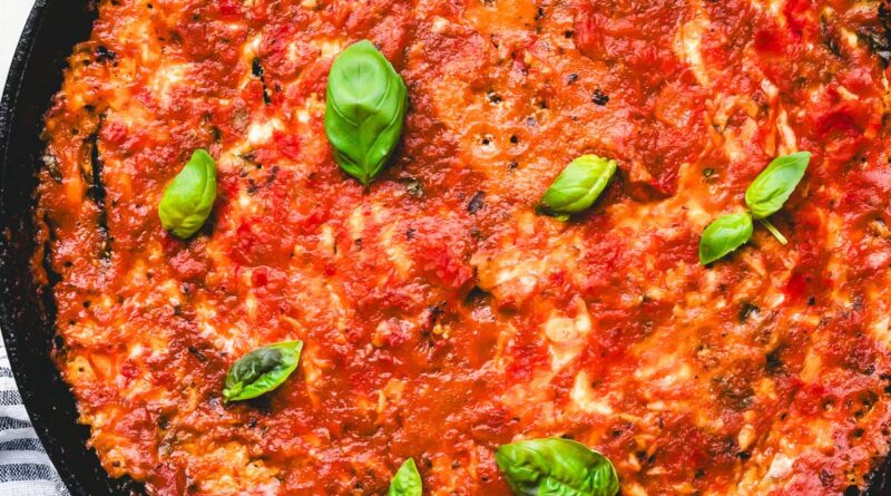 - Assemble the Eggplant Parmesan: Coat the bottom of a cast-iron skillet with marinara sauce. Add the eggplant slices, followed by the basil, mozzarella, and ricotta mixture. Repeat 2 more times, ending with the sauce on top. Cover the skillet with foil.
