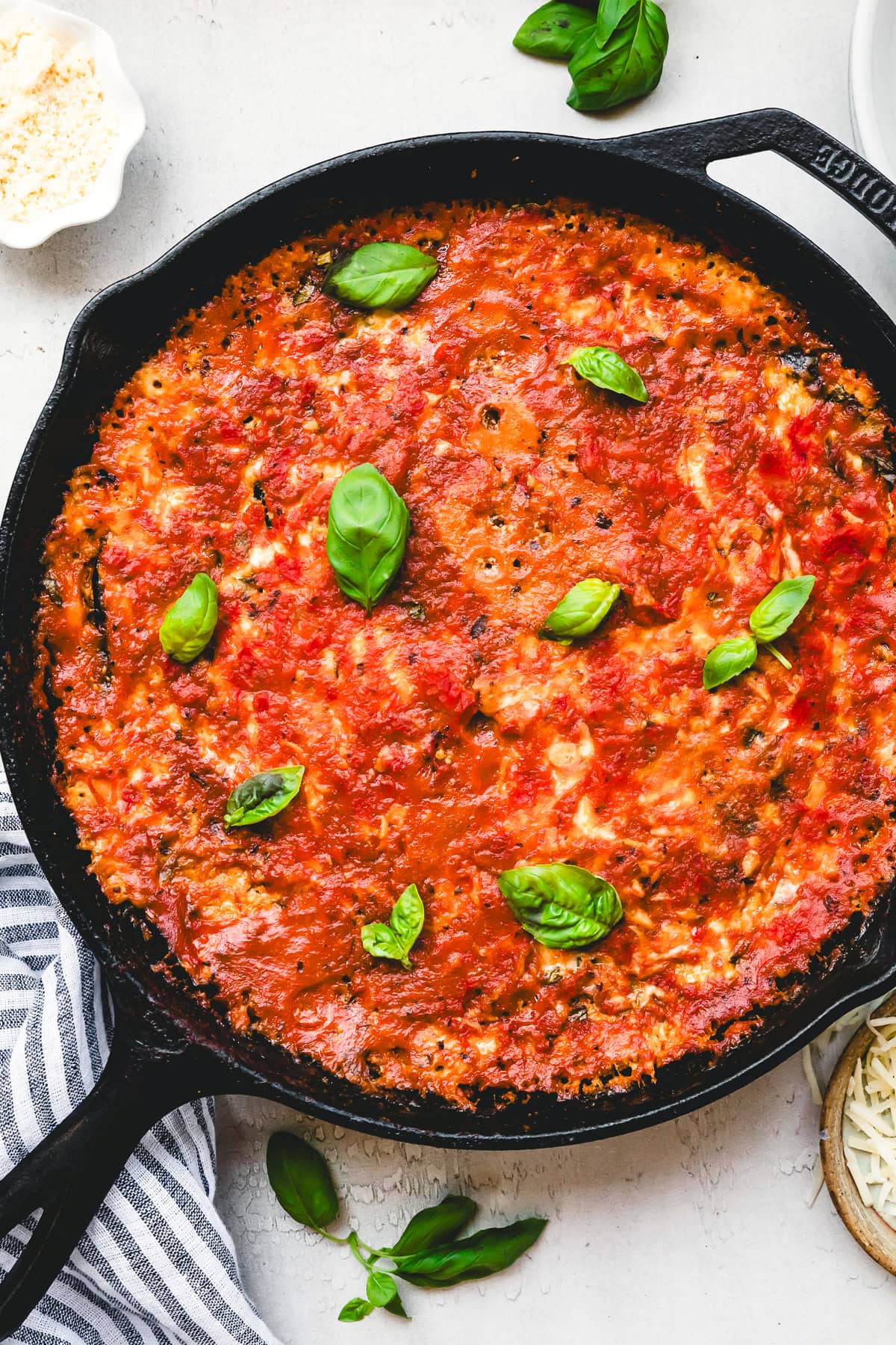 Cover the base of a 10-inch cast iron skillet with a heaping ½ cup of the marinara sauce. Layer the eggplant to cover the sauce, 5-6 slices. Top with a third of each the basil, mozzarella, and ricotta mixture. Repeat the layers two more times starting with the sauce and ending with the cheeses, being sure to spread the sauce into an even layer. Top the last layer with the remaining sauce and spread to cover completely.
