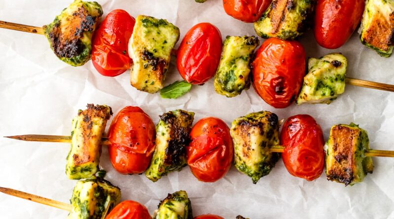 These pesto chicken kebabs are an easy appetizer to eat while mingling at a party. If you’re having them for dinner, I would serve two with a salad, a simple caprese salad, tomato salad or grilled veggies. You could also make pasta and mix in the tomatoes and chicken or serve with Italian Pasta Salad.