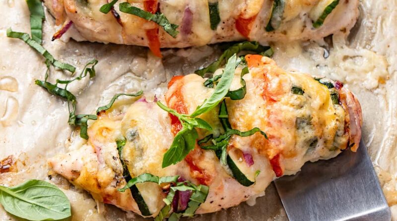Easy Hasselback Chicken Primavera made with chicken stuffed with vegetables and mozzarella. A high-protein sheet pan dinner perfect for busy weeknights.
