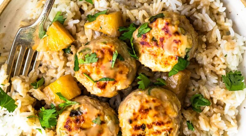 Juicy chicken meatballs in a creamy coconut sauce with chunks of pineapple, ginger, lime, and cilantro. It’s a sweet-savory, island-inspired dinner that’s perfect for a weeknight.