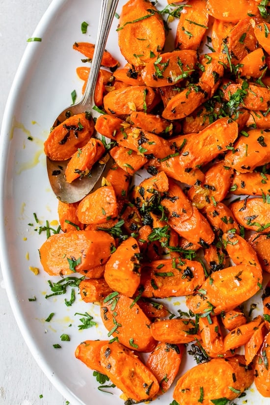 Nothing beats the natural sweetness of oven-roasted carrots, which are elevated by using fresh herbs. They come out savory and delicious! This recipe calls for two pounds of carrots, but you can easily halve it if you need to serve fewer people. A few other carrot recipes you may also enjoy are these Roasted Carrots with Ginger, Spiralized Carrot Salad, and Za’atar Roasted Carrot and Chickpea Yogurt Bowls.