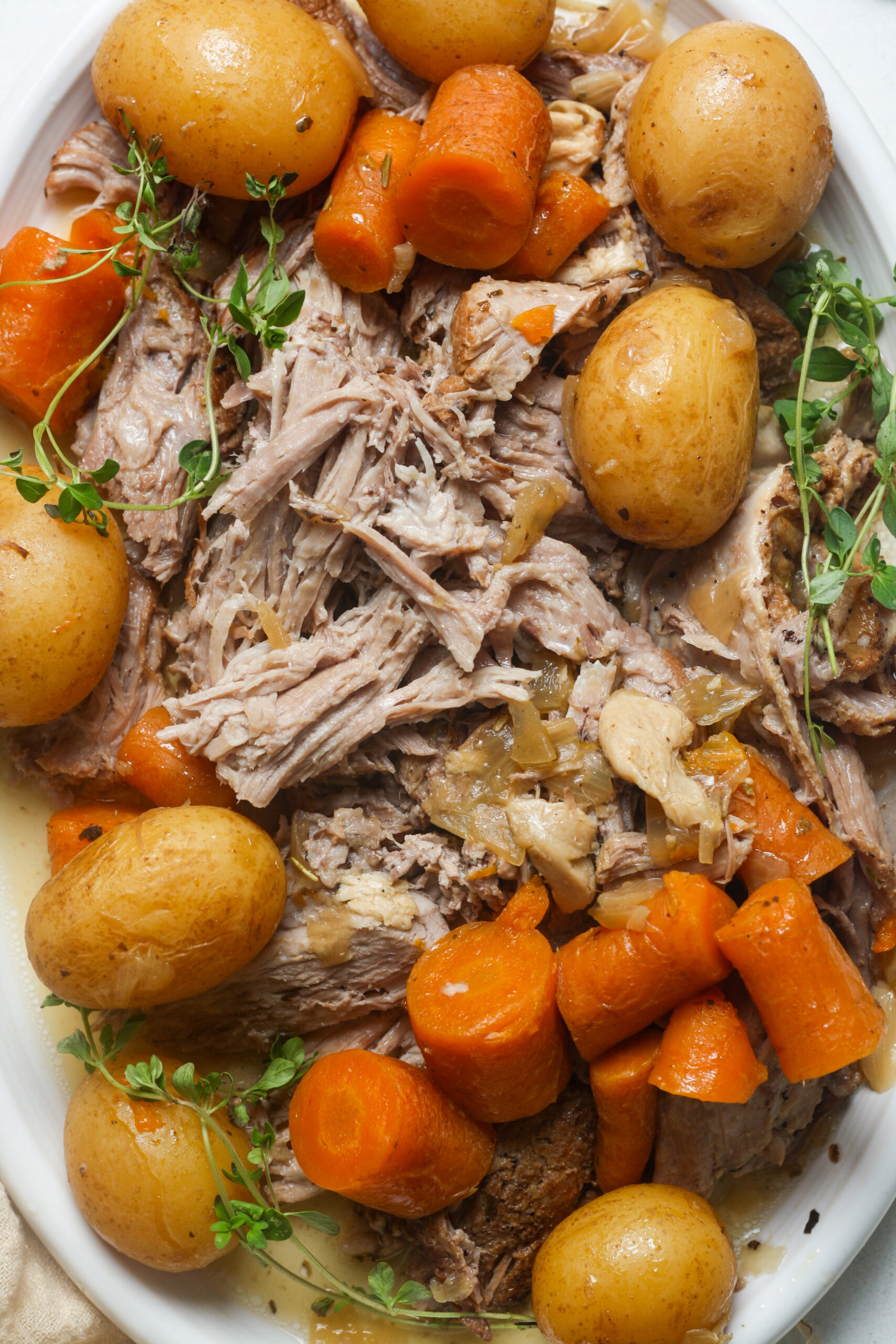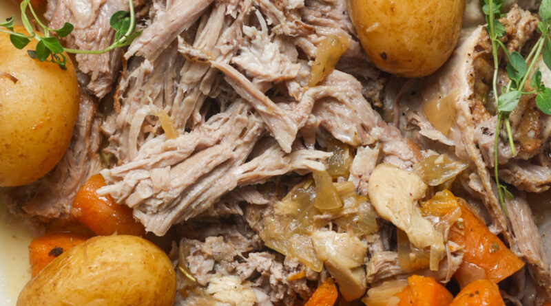 Remove the pork and veggies from the pot. To make a thicker gravy, remove ¼ cup of juice from the pot. Mix with 1 tablespoon tapioca flour. Return this slurry to the pot and mix until slightly thickened.