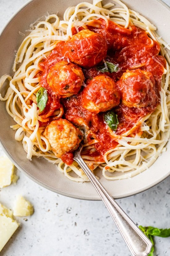 My Italian husband loves his mom’s beef meatballs, so making them with ground turkey without him complaining was not easy. Don’t get me wrong – we love meatballs made with ground beef, but I also love these ground turkey meatballs as a lighter alternative. Tommy gives these 2 thumbs up!