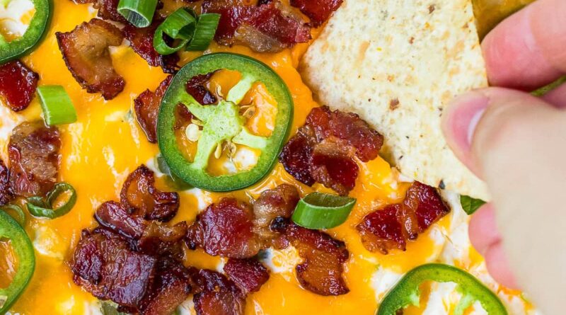 - How to Serve: Top with bacon, scallion greens, and sliced jalapeños. Serve with crackers, tortilla chips, pretzels, or a crudité platter with vegetables like carrots, cucumbers, or celery.