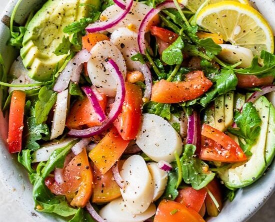 I grew up eating hearts of palm right out of the can, so adding them to salads is nothing new to me. They have a slightly nutty flavor similar to artichoke hearts, with a creamy and crunchy texture. They combine perfectly with lemon, arugula, and avocado. If you’re new to hearts of palm, they are sold in a jar or can at the supermarket, and they even come in noodle form, which I used in this Hearts of Palm Noodle Peanut Stir Fry. Make it a meal with protein like chicken breast, shrimp, air fryer roasted chickpeas or salmon.